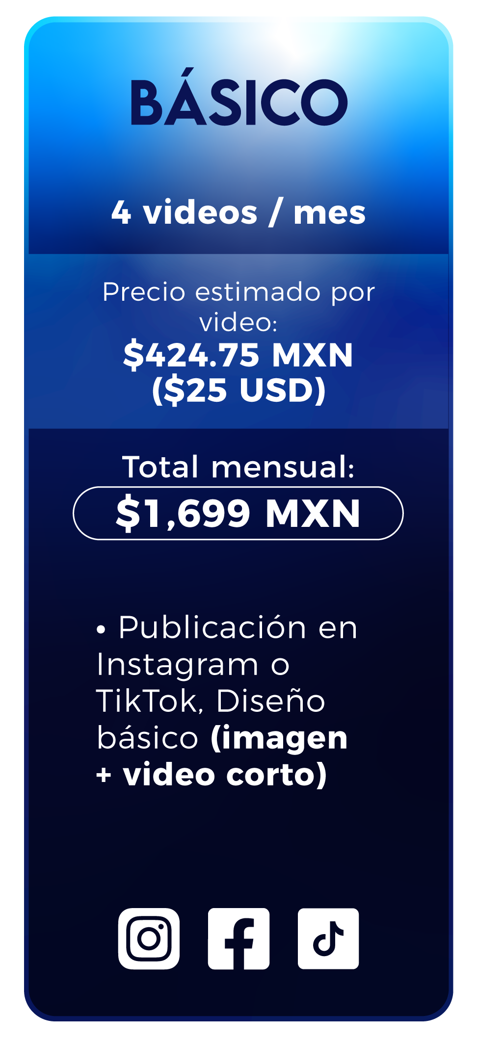 1 video promocional y hasta 4 videos cortos para redes sociales por mes.
