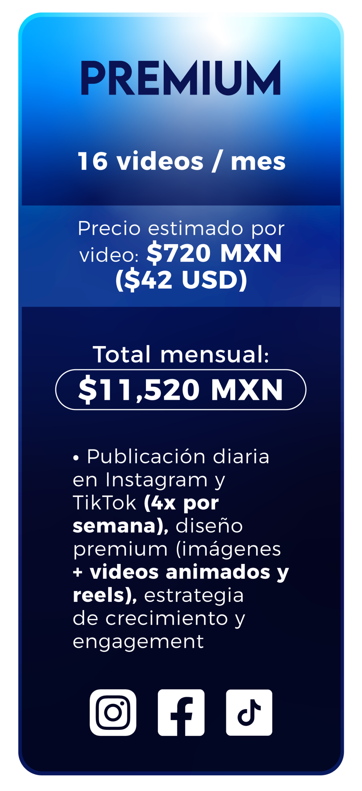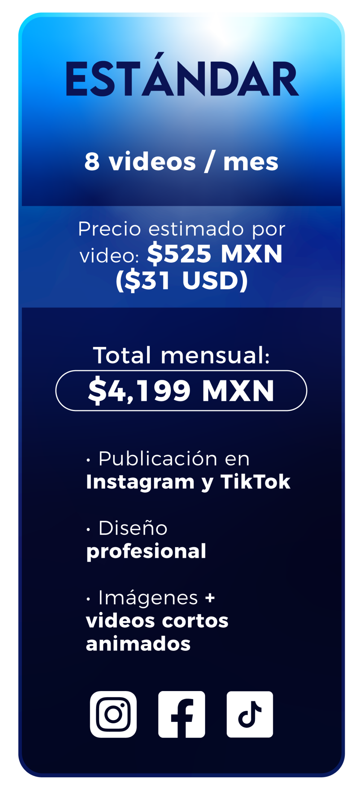 2–3 videos promocionales y hasta 8 videos cortos para redes sociales por mes.